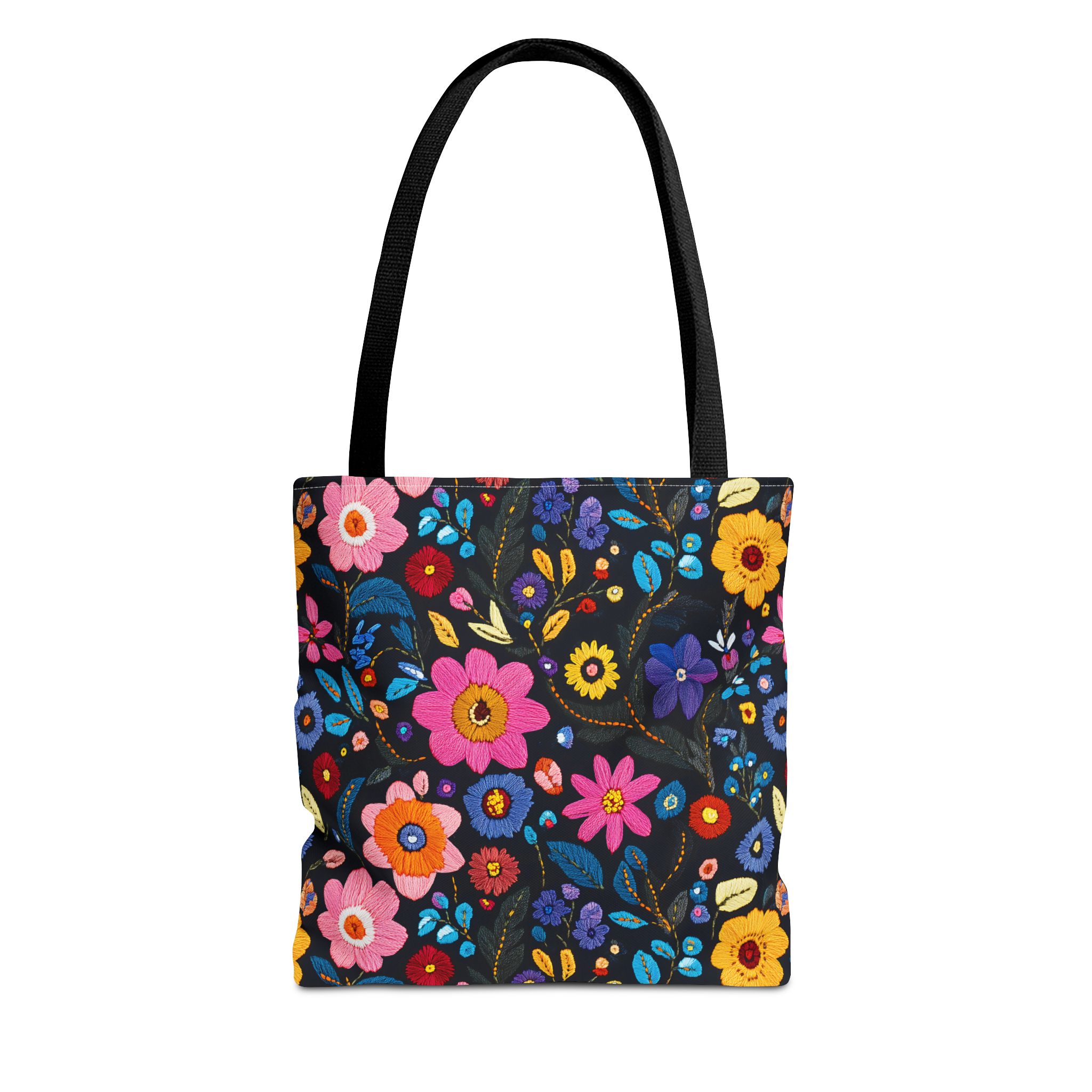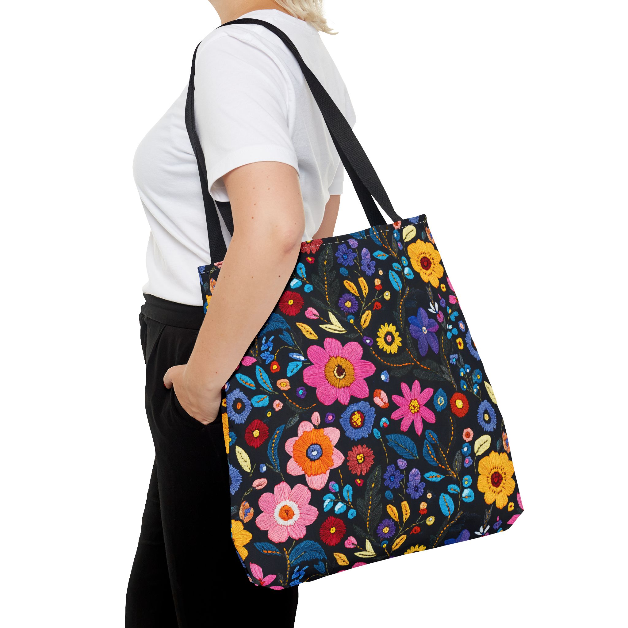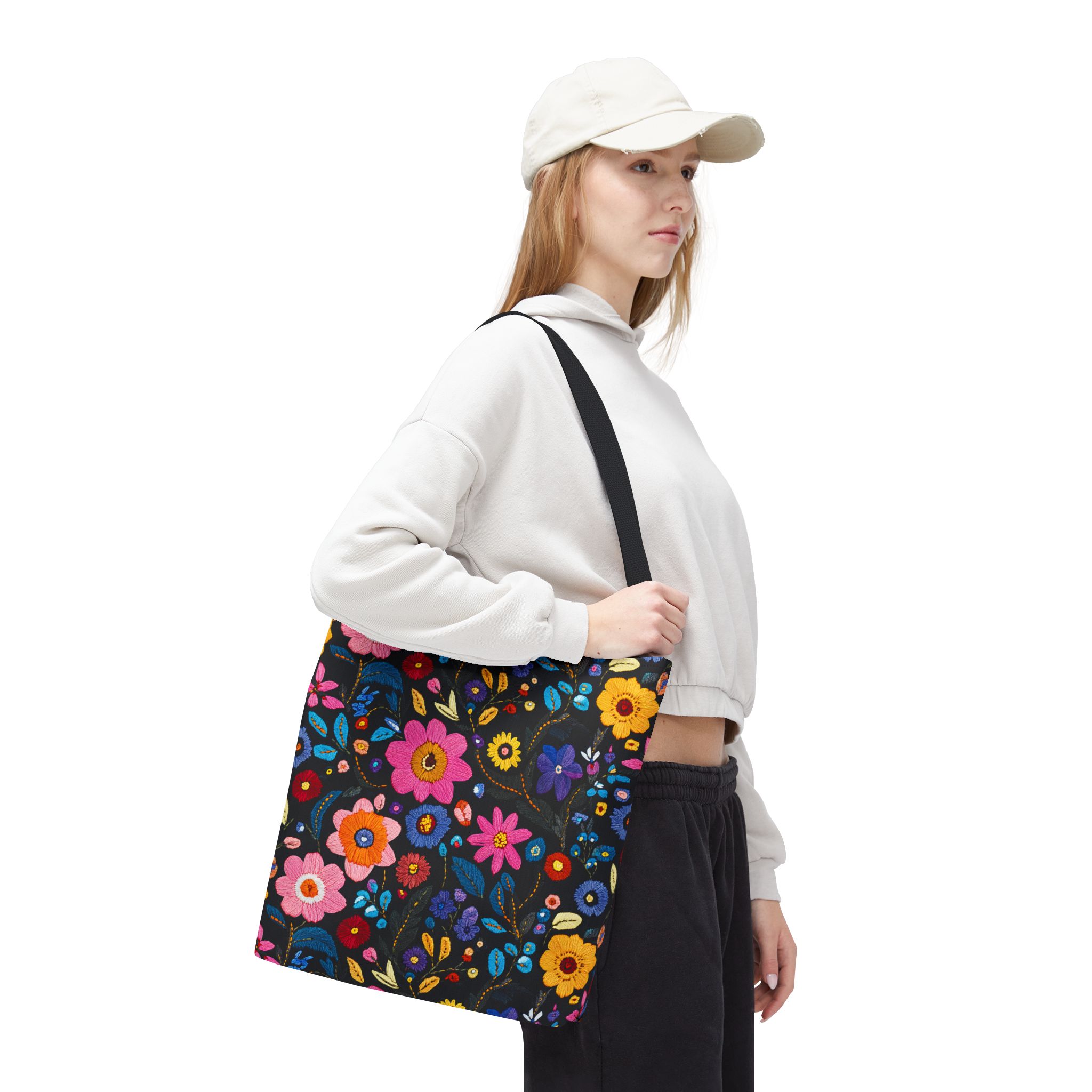 Vibrant pink floral flowers Tote Bag perfect for everyday use. Made with durable 100% polyester fabric and reinforced stitching on handles. Adds a pop of color to any outfit and is ideal for carrying groceries, books, or essentials. Great for women who love floral patterns and bright colors. Perfect for Mother’s Day, birthdays, or as a reusable shopping bag. Product features – 100% Polyester body for strength and quick drying – Reinforced stitching on handles for durability – Boxed corners for extra room – Available in 3 sizes with 5 handle options – Lined with non-woven laminate for added structure Care instructions – Remove all items from the bag before cleaning. Suggested to pretreat visible stains with stain remover. Mix warm water with laundry detergent and clean the bag with terry washcloth or a soft bristle brush. Let the bag air dry.